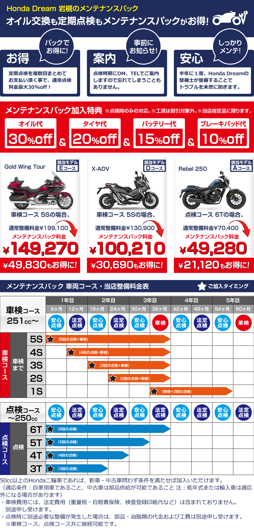| Aコース | CB250R/Rebel250/CRF250/CL250/GB350 | 12,320円 | 18,480円 | 24,640円 |